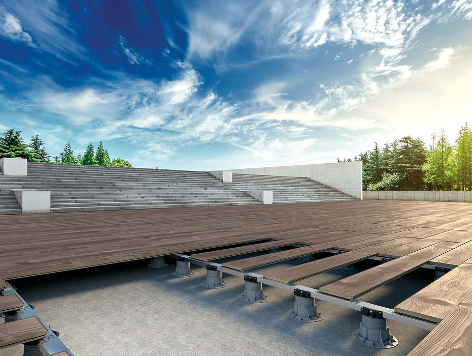 Raised flooring systems are used to create level outdoor surfaces above uneven or sloped substrates. They provide adjustable support for outdoor applications such as decking, paving, balconies and terraces, whilst allowing drainage and service access beneath the surface of the raised floor.